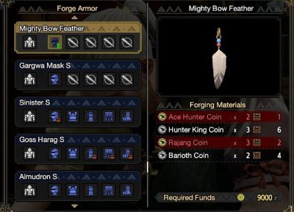 When you finally get all these coins you will have to go to one of the two blacksmiths in Kamura Village. There you will be able to put all these items together and craft the Mighty Bow Feather. Good luck in your further arena battles!