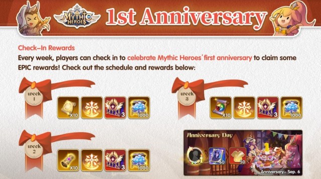 Players can check in every week to claim these rewards. But wait, there’s more! In addition to these check-in rewards, Mythic Heroes is offering some anniversary specific events for players to enjoy.