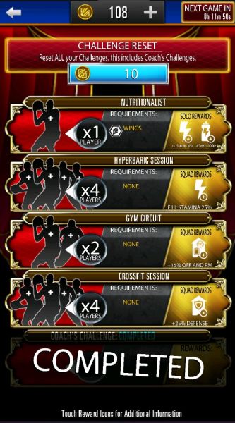 Games are 15 minutes long followed by a 40 minute break period in between. Complete as many Challenges as you can in order to boost your players stats, replenish their stamina and have them ready for the big games. Keep in mind that each player can take part in one challenge before each game.