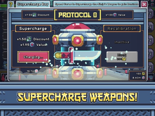 After you progressed a bit, you will unlock the Supercharger. You can spend cores to powerup your ninja’s sword, which increases your overall power. How this works is that supercharging increases the value of depleted cores, and as a sweet bonus you get a discount in the Research Lab!