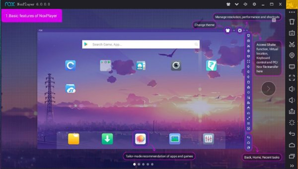 The “basic features of Nox App Player” diagram that displays after the installation process completes is extremely helpful. It shows you what you need to know in order to get started such as the ability to drag and drop APK files, where to find settings, and how to navigate.