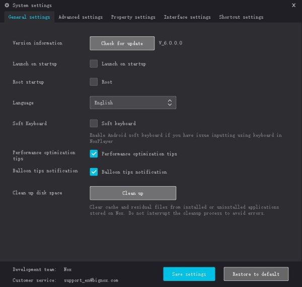 Under General, you can check for updates, enable the launch of Nox App Player on startup, change the language and clear the cache and more. Everything is self-explanatory.