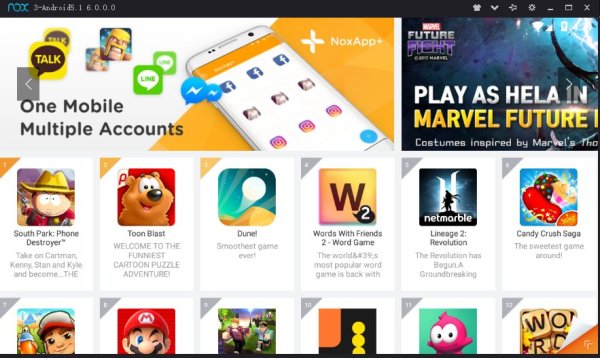 In addition to the usual Play Store, in the right upper corner you can see a little icon of Play Market. It opens a whole set of casual games, which are recommended by the developers of the Nox App Player.