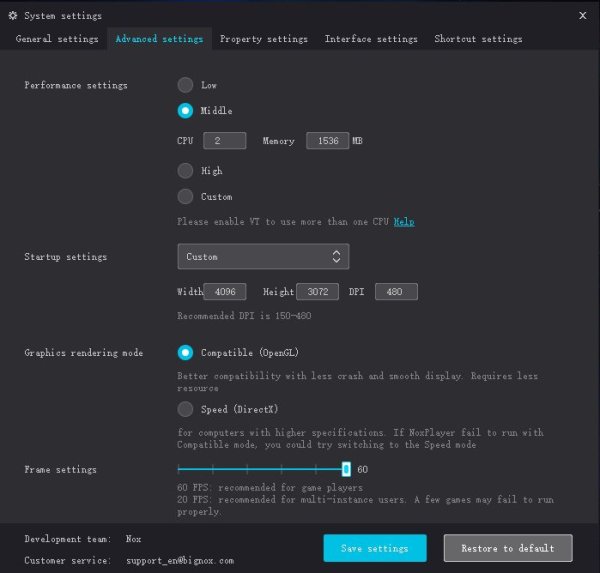 Under Advanced, you can change the performance settings, startup settings, frame settings, and graphics rendering mode. If you want to use more than one CPU or more memory than the default setting, you can change that here.