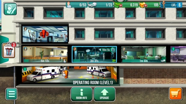Operate Now: Hospital unfortunately has too much downtime. Like we mentioned the story is unraveled through task completion, but you’ll only have a set amount of tasks at a time. Tasks are divided into three categories: red tasks are operations you’ll need to actively complete, blue tasks are timed tasks that you have to send your staff out to take care of, and green tasks are passive tasks that require you to reach a certain milestone. Tasks are assigned to you in tiers, so you’ll need to complete all of the tasks in a certain tier before you can advance. This leads to some very noticeable “choke points,” where you’ll be waiting on a specific task to finish, or be waiting for enough resources to complete a green task.