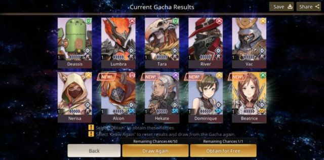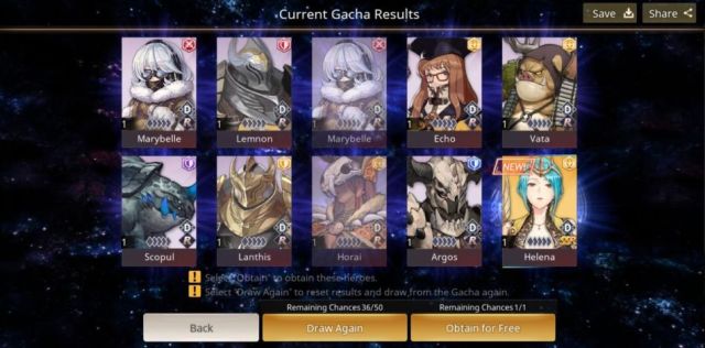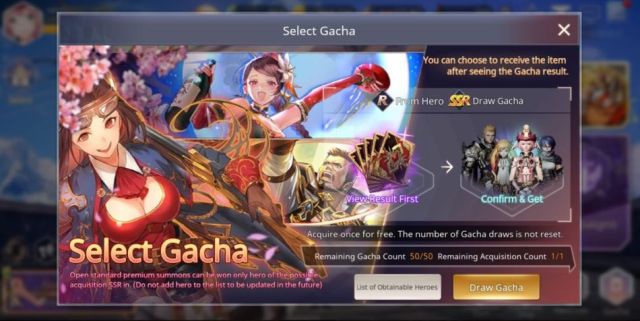 “Select” gacha will let you summon 10 random heroes, out of which 1 one of them will always be SSR rarity. You can re-do this up to 50 times for free, or until you get the hero that you want. If you get nothing good, we might have a little bit of an issue.