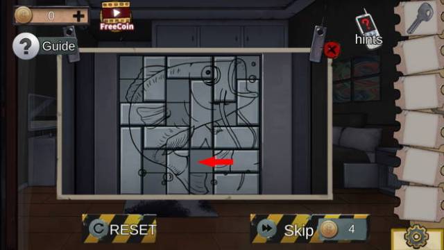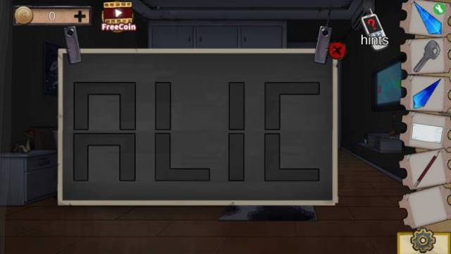 Examine the ottoman to find a 5-digit code key. Punch in 29467 to get the other red crystal piece. Slot the red crystal into the pencil box to get a pencil. Examine the dresser on the left and you’ll see a four letter code key. Remember the patterns from the sheets in both rooms?