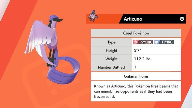 Galarian Articuno is a Psychic, Flying Pokemon, so make sure to have Pokemon with you that can deal Electric, Ice, Rock, Ghost, or Dark damage. You do not want to take out the Pokemon, however, so make sure to stop your offensive once its HP is low to catch it.