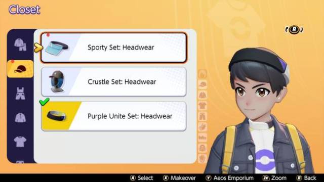 To change your trainer’s clothes, you’ll need to open the submenu on the main menu of the game by pressing the X button. A purple submenu will appear on the left side of the screen; select the Closet button to be taken to the dressing room.