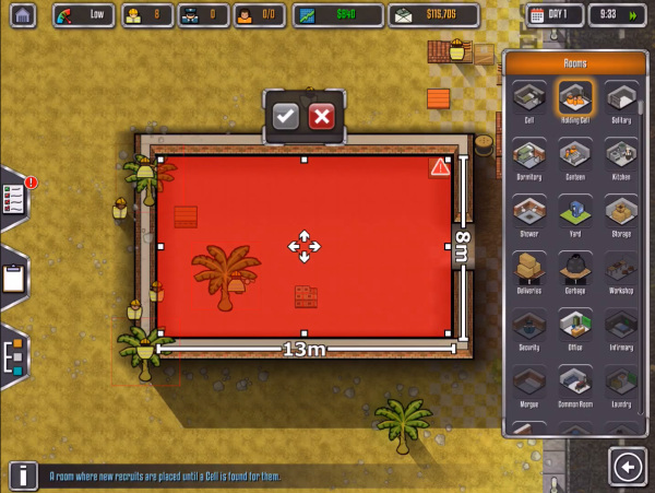Once you’re done with the campaign, you can take up the job of building your own prison from the ground up. If you took elements from both SimCity and The Sims, threw in a ton of variables, you’d end up with the general flow of Prison Architect: Mobile. To start off, you’ll obviously need some jail cells and facilities. You have to lay down the walls first, then designate that building as a certain facility. Each facility comes with furniture requirements, and the building won’t be counted as a proper facility until you furnish it correctly. There’s something very satisfying about building your own prison – as weird as that sounds.