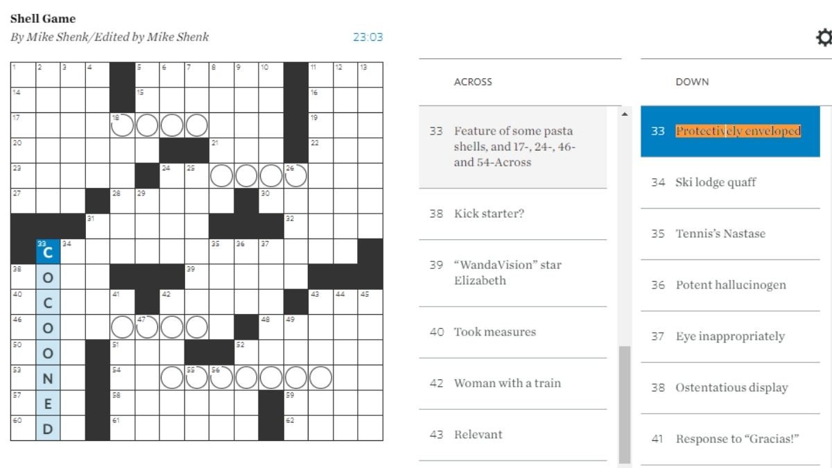 You can access The Wall Street Journal’s daily Crossword game via this link. Once you are on the game page, you can select the “Protectively enveloped” clue from the right-side menu. After that is done, you can use your keyboard to type in the answer.