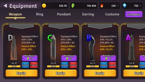 There are four different type of gears in Raising Archangel. Weapon, Ring, Pendant and Earrings. Each type of gear gives different kind of bonuses.
