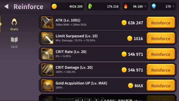 Start by maxing out Gold Acquisition (Maxes at lv200). The more gold you get the more resources you have to invest. Don’t bother with Critical Strike Damage until you have decent Critical Strike Rate.