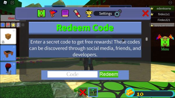 Redeeming a code in Build a Boat of Treasure is super easy. The only thing you have to do is tap on the Menu icon at the right side of your screen and then go to the Settings menu. Scroll all the way down until you find the ‘Redeem’ option. Type in the code that you found on our Build a Boat for Treasure List of Active Codes and tap on the Redeem button.