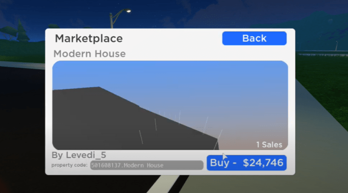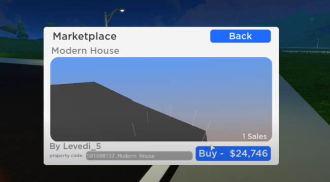 The game will take some time to load the preview, depending on how big and detailed the property is. Once it loads, you will have a chance to purchase it if you have enough in-game currency.