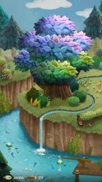 Your first order of business to get your secret forest haven up and running is to collect these resources. Swipe to the left and you’ll see a giant mystical tree with a river in the valley below it. Look closely at the different leaves of the tree – you should see little twigs sticking out. Tapping the shrubs will reveal wood, so tap and tap until you see no more twigs sticking out.