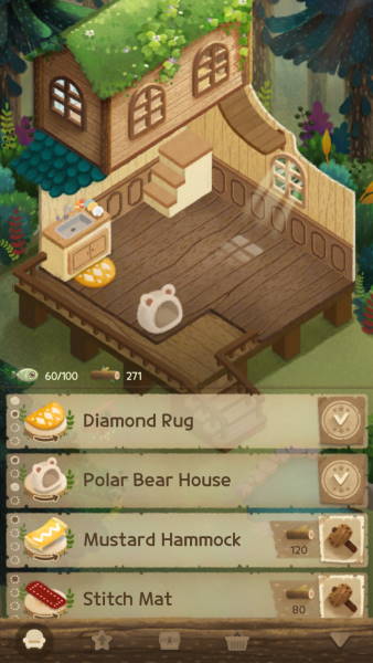 Now that you’ve got some resources to your name, it’s time for the best part – decorating your cabin! Swipe back over and you’ll be back at your cabin. Cats will come to your secret forest cabin only if they like the decor, so tap the button with the three lines at the bottom right corner.