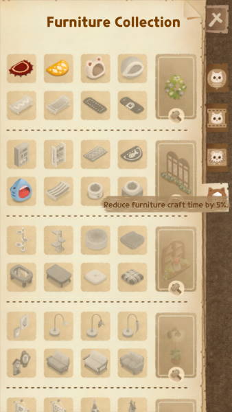 The final tab of your album archive hosts your Furniture Collection lists. Every piece of furniture in the game belongs to a certain collection, and building every piece in a collection will reward you with a special bonus, like a large amount of wood or reduced crafting times for your furniture. Do your best to complete as many collections as you can!