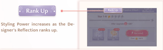 Go to the Designer’s Reflection menu and select the “Rank Up” tab. There you can rank up your designer’s reflection granted, you have the rank-up materials to ascend. Ranking up will cost you Coins and Memory Keys. But, in return, it will increase your Styling Power.