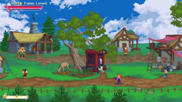 There are some minimal RPG elements in the game: you have a village that was pillaged and must be rebuilt, and you will actively be part of that. There, you will get to buy new weapons for your character, recruit new adventurers to play as, upgrade your weapons and so on.