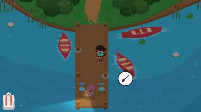 Once you have the oar, make your way to the middle of the campground from Sasquatch’s house. You’ll eventually reach an intersection with a sign that points south for the lake, so follow that down.