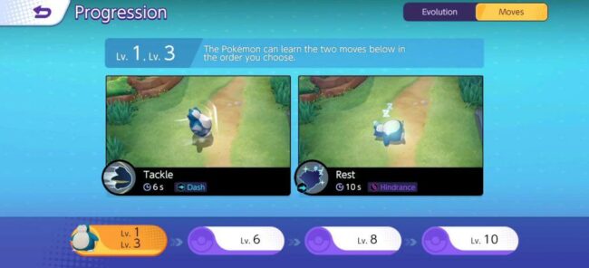 - Tackle (6s Dash): Has the user charge forward belly first, dealing damage to opposing Pokemon in the area of effect and decreasing their movement speed for a short time.
