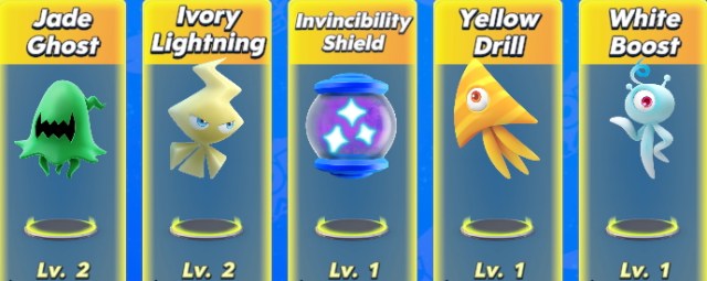 - Ivory Lightning: Strikes the racer in 1st place with lightning. Will be canceled if you take damage, and it can be dodged by the racer. Level ups increase damage and number of targeted opponents.