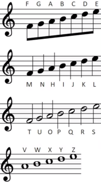 A Strange New Cipher puzzles look like a number of music notes and each of them means a certain letter. Here is an example of such music notes and their letters: