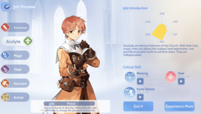 Some stats are not useful to a class who prefers to be a support role like the Acolyte. INT is mainly for magic-focussed heroes so that’s not worth spending points on and, although VIT may be useful for the max. HP boost, it is not what we would recommend focussing on. Instead, a Acolyte should be spreading their Attribute Points on DEX, STR, and AGI.