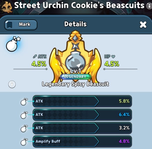 For this Bomber Cookie, you want to go for a Spicy Beascuit. The main stat you want to look at is Damage Resist Bypass. Since she can only get this stat from the Beascuit, and she is a damage dealer, you want to aim for Damage Resist Bypass. Of course, ATK is another sub-stat you want on the Beascuit.