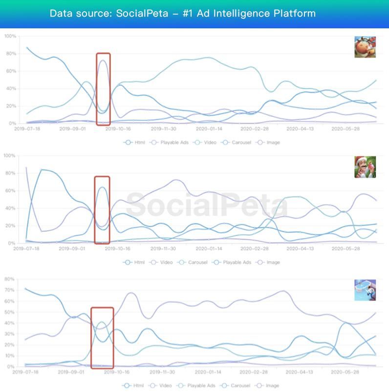 In light of the trend of advertisers’ creative types over last year from SocialPeta, the ad creative types of the four games were highly diversified, including but not limited to HTML, video, carousel, playable and images.