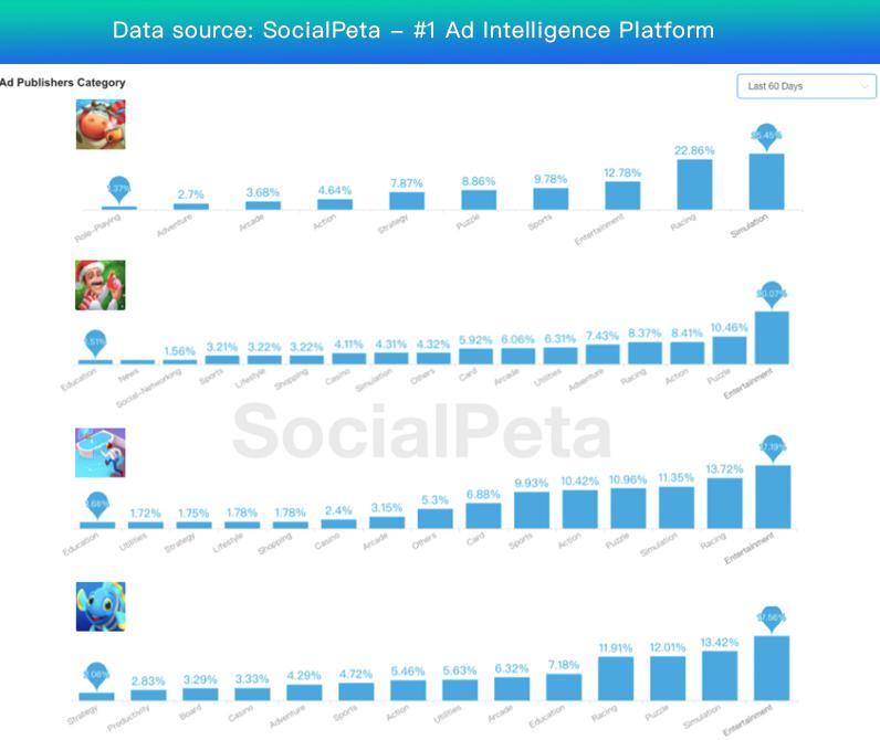 In terms of ad publishers, on account of data analysis of the four advertisers’ advertising in the last 60 days, it can be concluded that Playrix’s recent advertising is mainly put on entertainment, simulation and puzzle publishers.