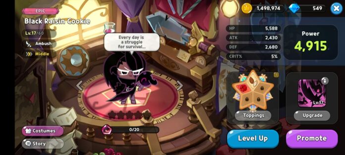 Black Raisin Cookie’s special attack is called ‘Shadow Watcher’. She vanishes and appears in the midst of the enemy squad and attacks them causing heavy damage. You can pair the Black Raisin Cookie with Searing Raspberry topping.