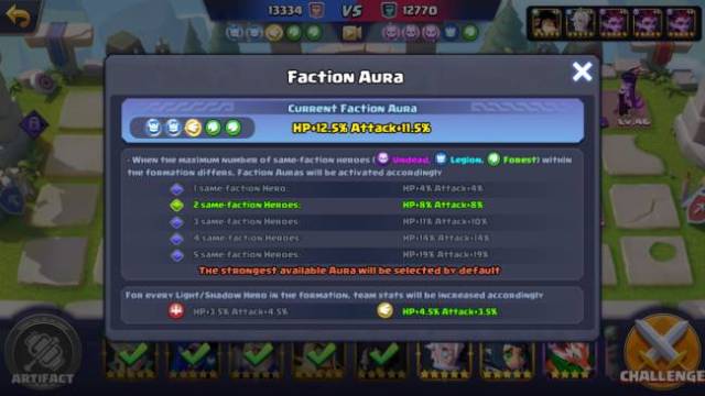 In addition to the Faction Advantage, you also get a bonus for using multiple heroes from the same faction called Faction Aura. The Faction Aura’s strength increases with the number of same-faction heroes you have on the team. Light and Shadow heroes have their own individual bonuses.