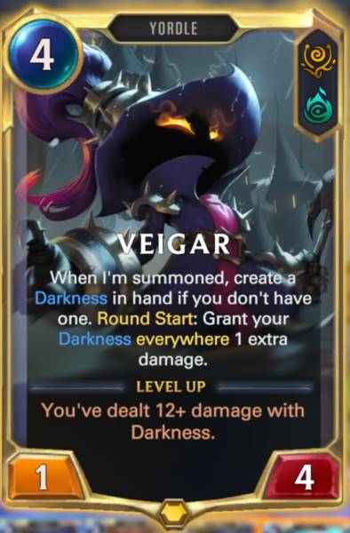 Veigar is a Yordle card with 1 power and 4 health that costs 4 mana to summon. His special ability creates a Darkness card in your hand if you don’t already have one. At the beginning of a round, your current Darkness cards gain 1 extra damage. Veigar will also level up once he deals 12+ damage with Darkness cards.