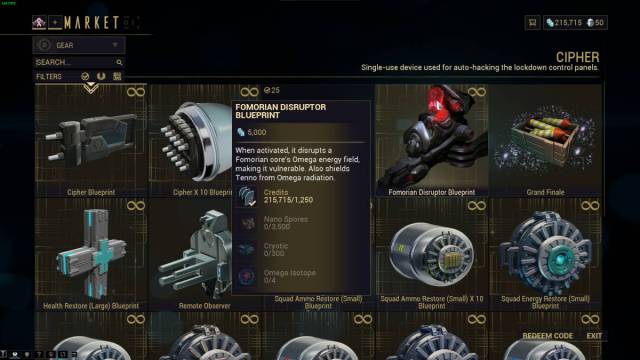 To begin, you’ll need the Fomorian Disruptor blueprint, which can be purchased from the Market. It can be found under Equipment, then the Gear tab. The blueprint costs 5,000 credits, and you’ll need the following materials to craft it: