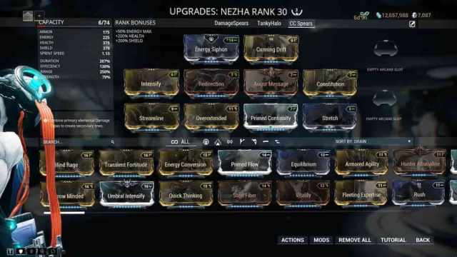 It’s pretty straightforward, and it makes good use of a lot of range and duration to inflict Divine Spears on your foes. You usually don’t need a lot of efficiencies, and Primed Flow is a waste of a mod slot when you can regenerate your energy with other methods (such as Energizing Dash and Energy Siphon).