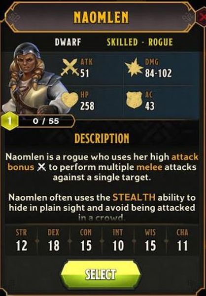 Naomlen has high attack bonus, ad she can perform multiple melee attacks on the same target. She also has a stealth which allows her to avoid getting hit when facing multiple enemies. She could be good in a team with a tank, to alleviate some of that pressure because her AC and HP are not that high.