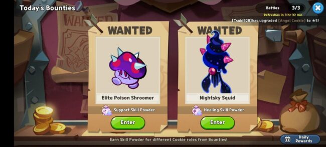 To view and play the day’s Bounties, tap on the Bounty area. Winning Bounties will give you coins and Skill Powders. Here’s a guide on how to play the Daily Bounties.