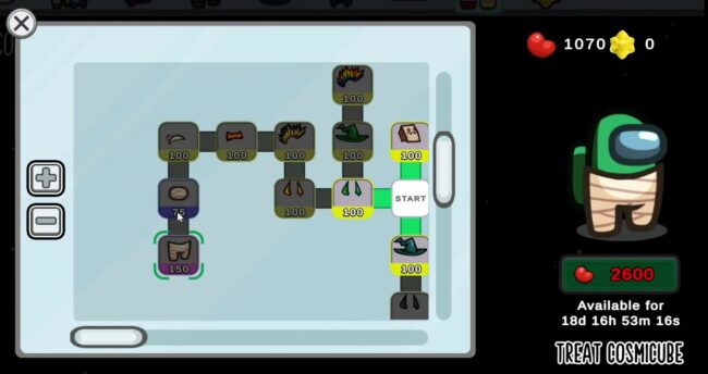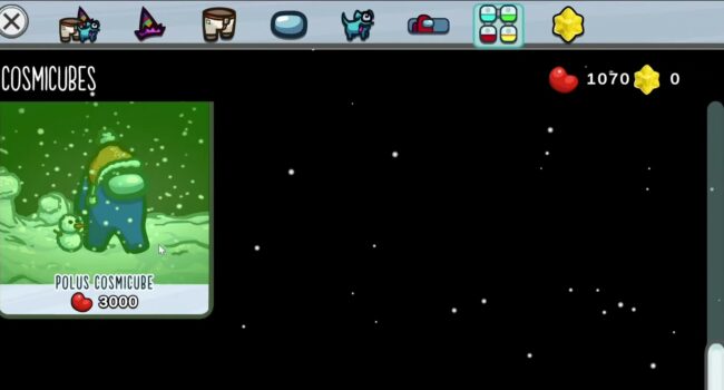 First of, if you want to use or spend your Beans in Among us, you’ll click on the $ sign below the main menu screen and enter the shop. Once in the shop, click on the four coloured button and it’ll take you a different section in the shop titled Cosmicubes.
