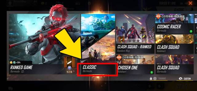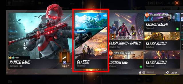 - Open Free Fire and navigate to the mode selection menu on the top right corner.