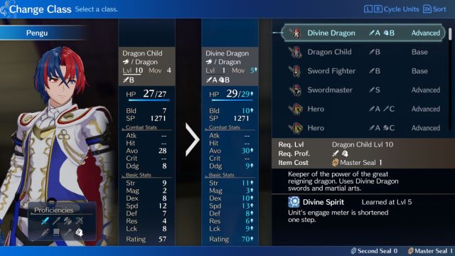 Upon reaching level 10, a unit can change their class to an advanced class. The process requires a Master Seal, which can be obtained at multiple points throughout the main story.