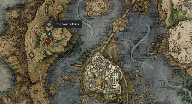 You can find the Four Belfries Site of Grace west of the Academy of Raya Lucaria, located in the Liurnia of the Lakes region of Lands Between. You can follow the main path on the map as it will lead you to the Four Belfries.