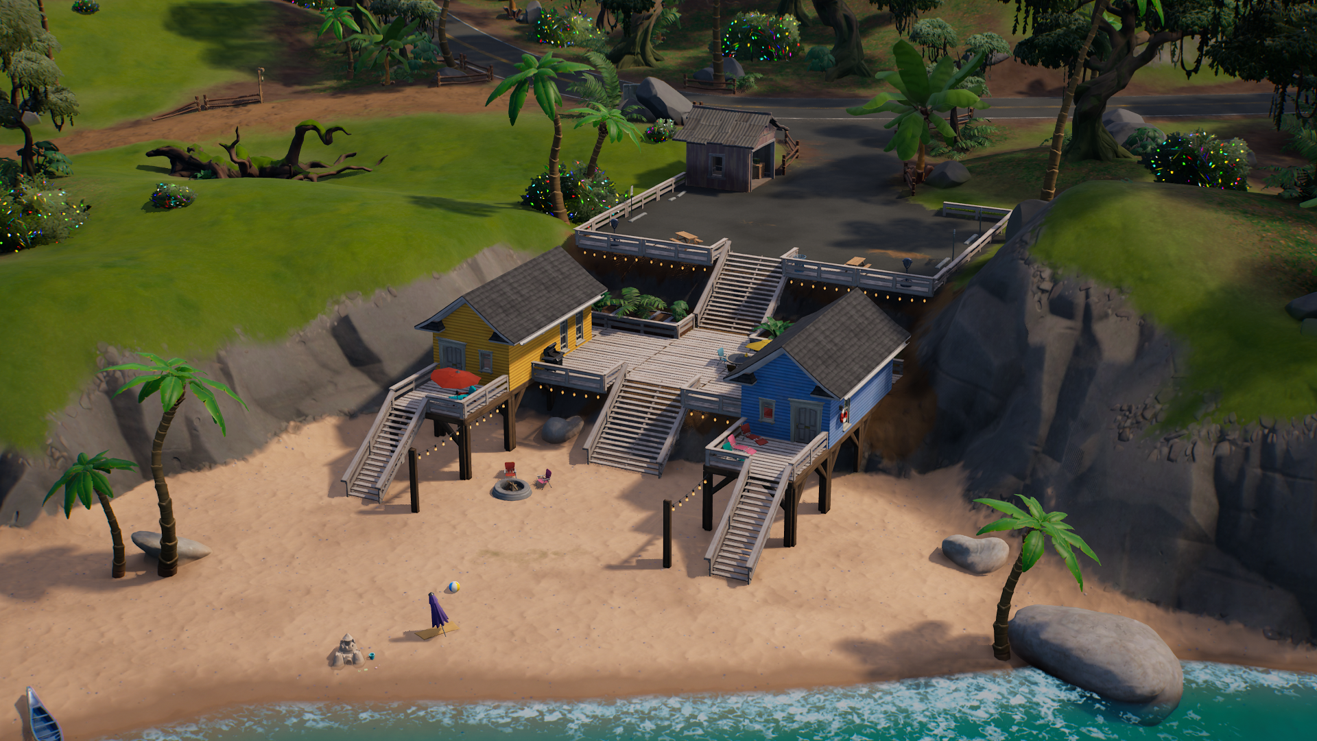 The beach will have two small buildings (a yellow one and a blue one) and also boasts some decent loot. You can easily land at this location at the start of the match and collect the Level Up Token. It will be on the sand at the end of the main stairs leading to the beach, near a firepit.