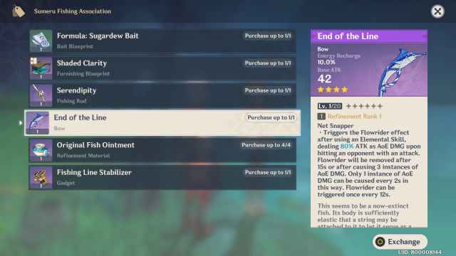 - Did you know? You can get a free four-star bow by exchanging some exotic fish with Sumeru Fishing Association. Check out how to get End of the Line bow in Genshin Impact for more details.