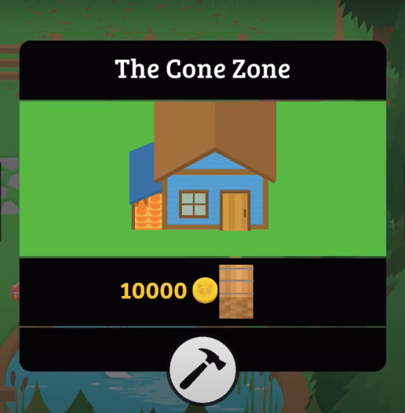 Next, visit the Workshop and speak to Construction Duck about building the Cone Zone. You will need 10,000 Coins and a large pile of lumber (about 100 wood). Get a pickup truck and drive up to the Sawmill for lumber.
