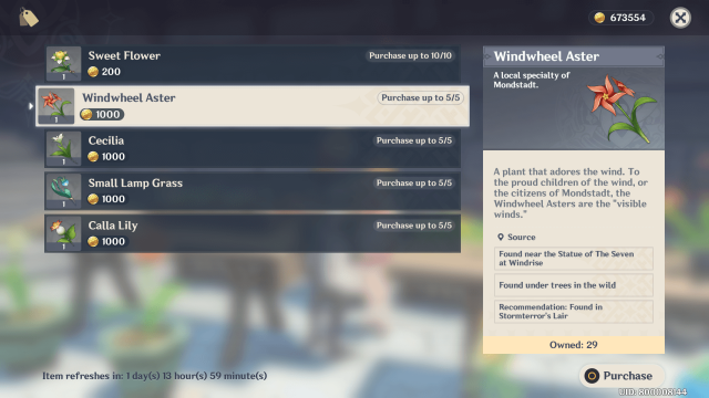 In the starting city – Mondstadt, there’s a little girl who’s a florist, players can buy Windwheel Aster from her.
