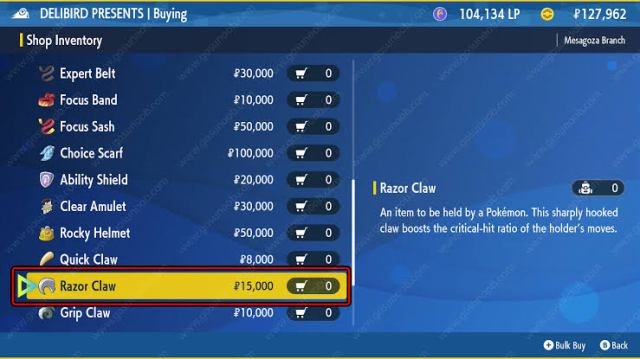 And although it’s not going to help many Pokémons evolve, do try to use it to evolve the few you can. The Razor Claw also allows you to boost the critical-hit ratio of any Pokémon that’s equipped with it in battle, so the more you can afford, the better.