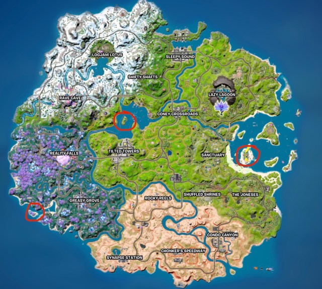 These 3 unnamed locations are spread across the map from west to east. One is situated west of Greasy Grove, one north of Tilted Towers, and another is east of Sanctuary under the statue.