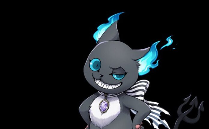Grim very closely resembles a cat. His fur is grey in color, with a white patch at his chest along with pink paw pads, coupled with stylized electric blue flames blazing from his ears. His eyes are bright blue as well. Around his neck, he wears a black-and-white striped bow tie which is torn at the ends; it also bears a light purple gemstone that rests against his chest. His tail is shaped like a pitchfork.